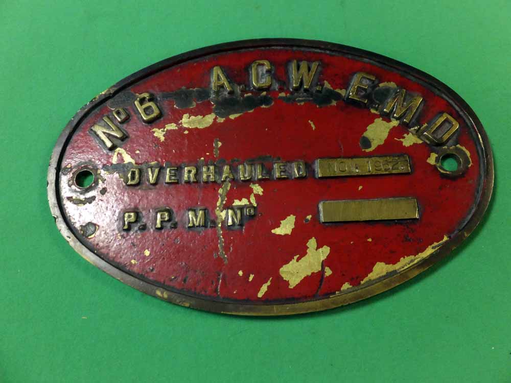 Acquired on behalf of the Chasewater Railway Museum, the brass plate is oval in shape, approx. 12″x 8″ with cast in lettering No.6  A.C.W.   E.M.D.  Overhauled with date stamped Nov. 1962.