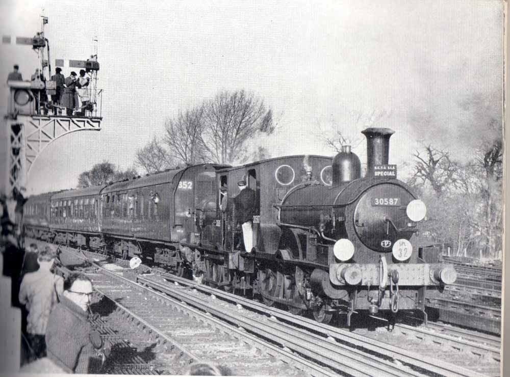 Two of the then three remaining Beattie 2-4-0 Well-tank engines, used on the Wenford Bridge line until 1962, on an RCTS railtour shunting at Hampton Court station in December 1962. The engines were 30585 and 30587 – G.D.King.