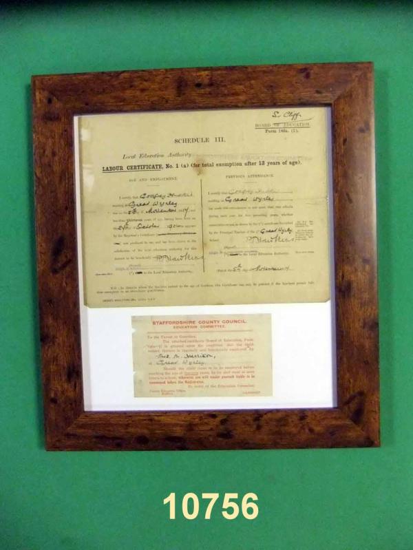 10756 Framed certificate Permission to leave school at 13 years of age. Staffs County Council