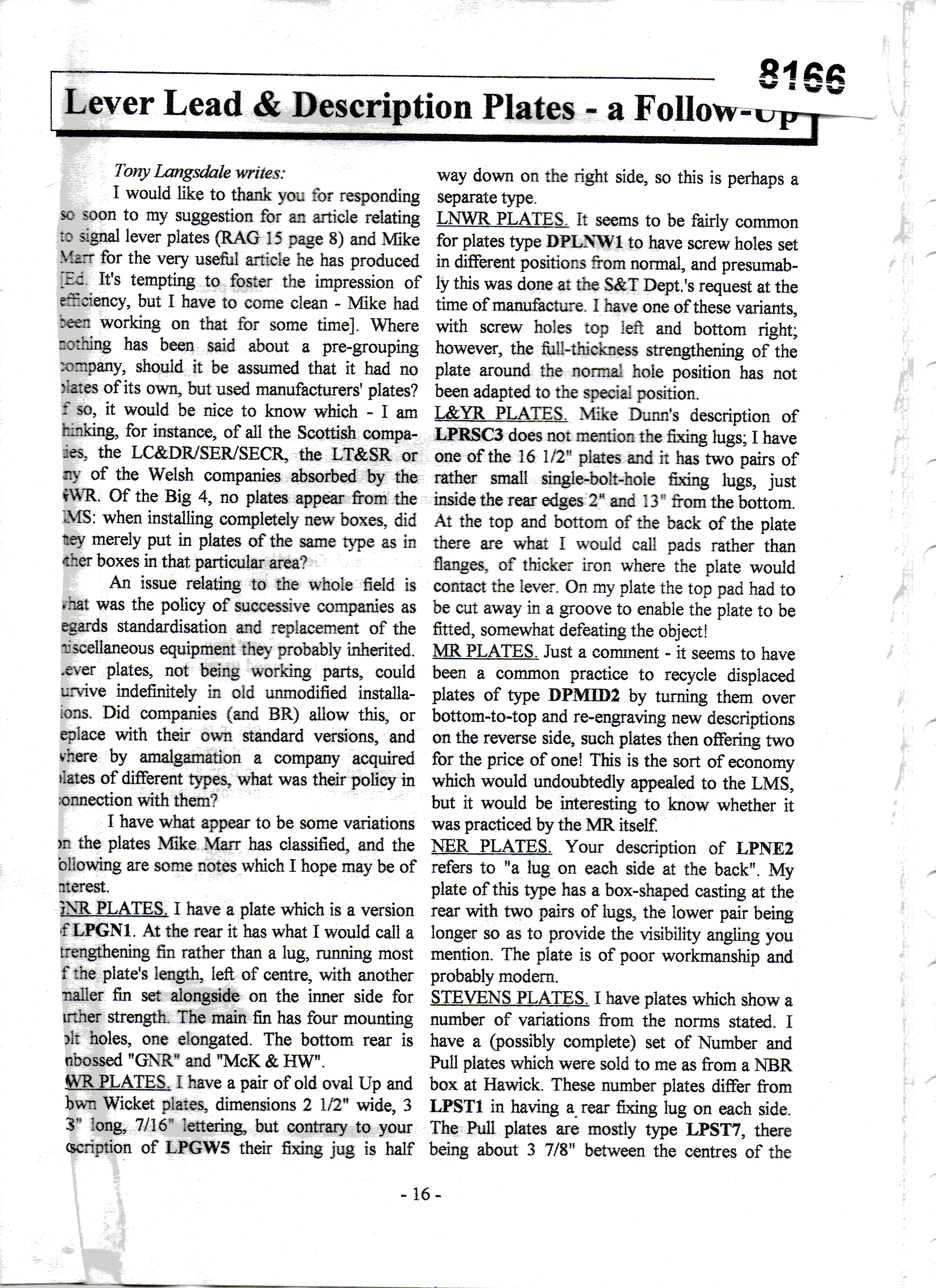 8166 Information Sheet Lever Lead & Description Plates Tony Langsdale Arch File 5