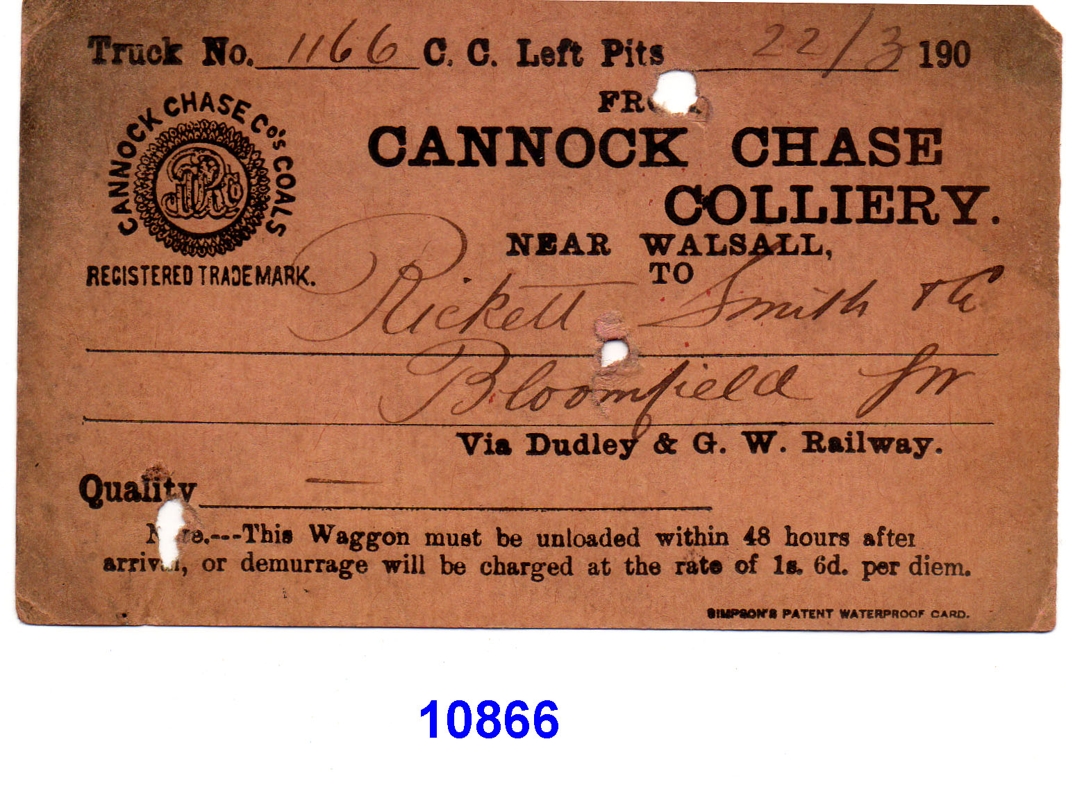 10866 Wagon Label 1900s Cannock Chase Coll to Bloomfield Fm Cannock Chase Colliery Company 10346