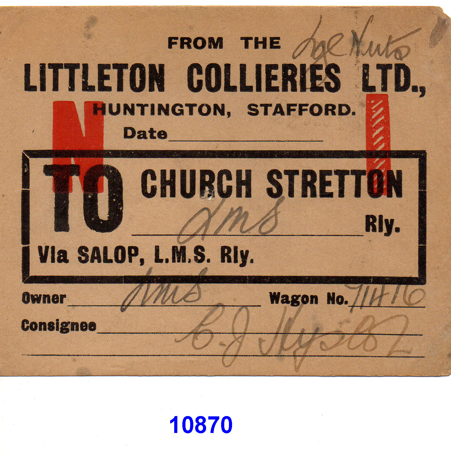 10870 Wagon Label Littleton Colliery to Church Stretton Littleton Colliery 10346