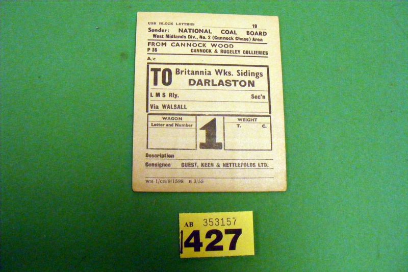 1427 Wagon Label Cannock Wood to Britannia Sidings, Darlaston NCB C15