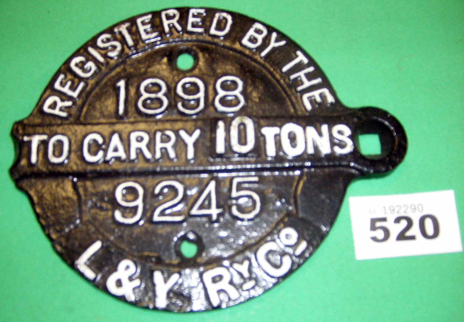 520 Wagon registration plate ‘To carry 10 tons’ 1898 No.9245 L&Y L&Y C19