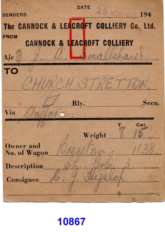 10867 Wagon Label 29-11-1946 Cannock & Leacroft to Church Stretton Cannock & Leacroft 10346