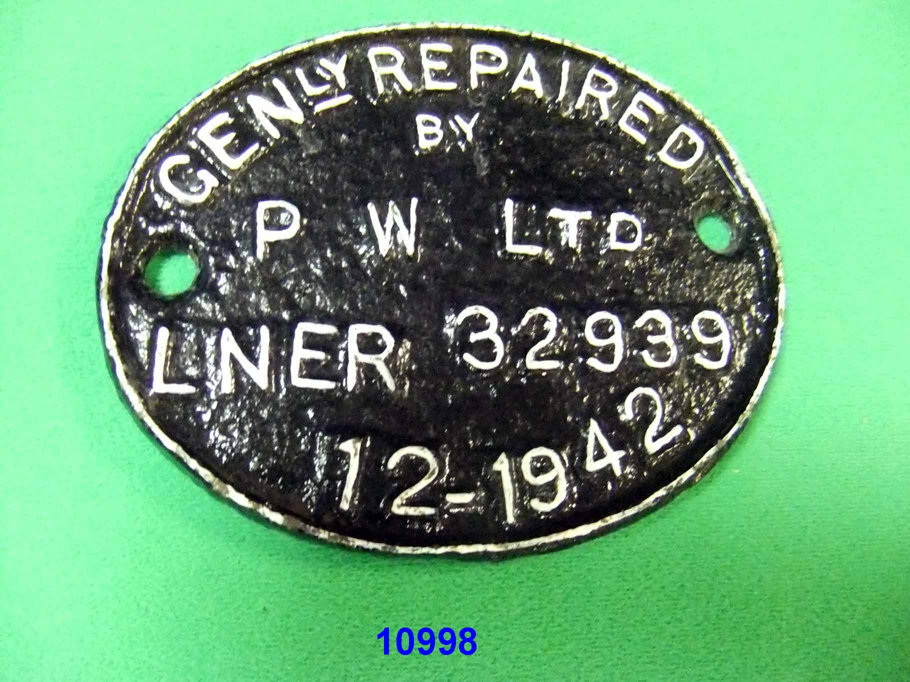 10998 Wagon plate LNER 32939 – 12-1942 – Gen Repair – oval – 5″x 4″ PW Ltd SC19