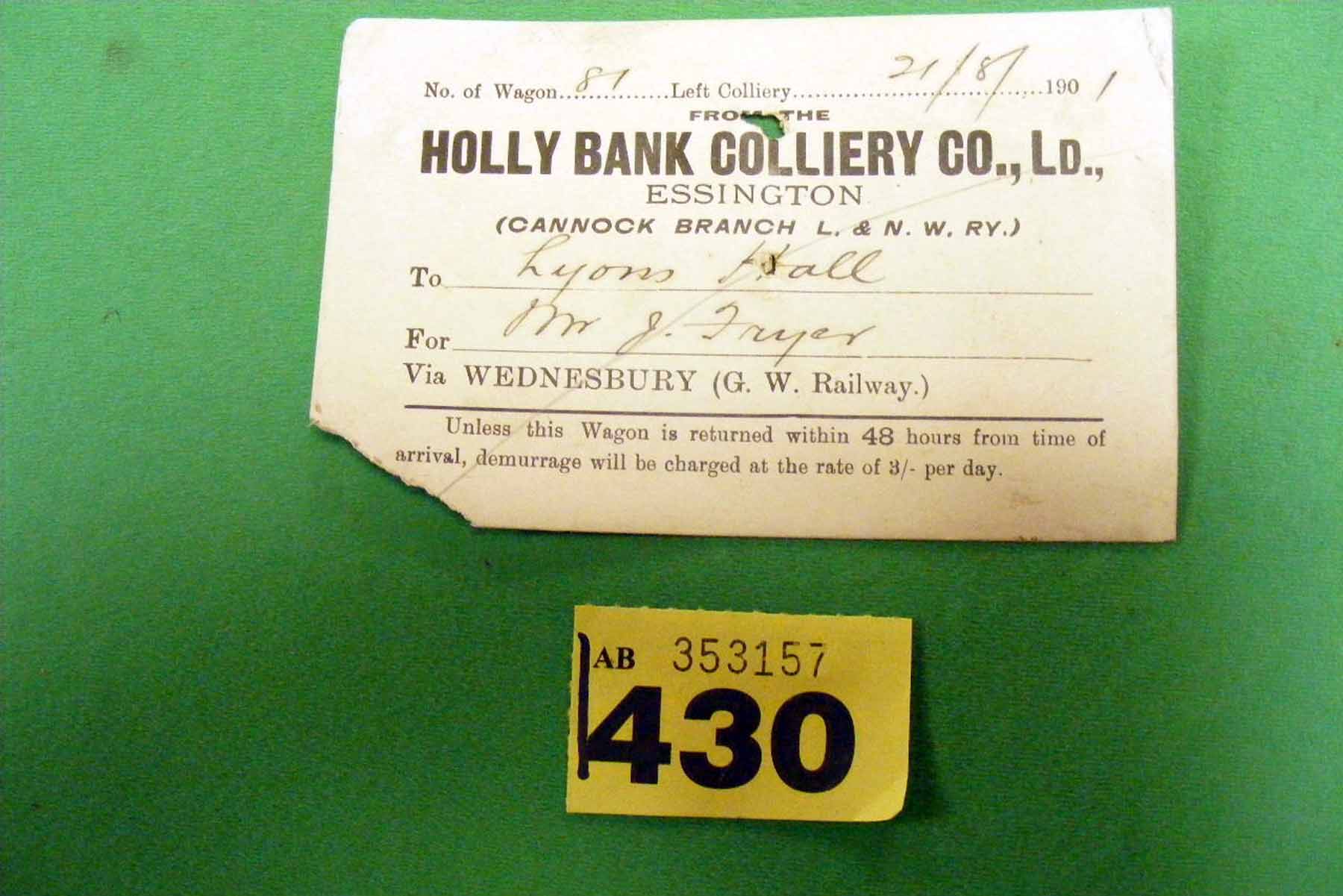 1430 Wagon Label 1901 – Holly Bank Coll., Essington to Lyonshall via Wednesbury. Holly Bank C15