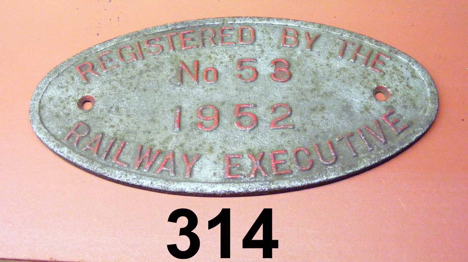 314 Registration plate 53/1952 Ex Hunslet 6-coupled ST 1685/1931 ‘Nuttall’ Railway Executive C1