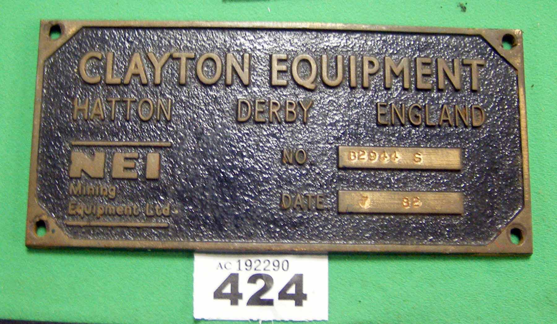 424 Works plate Clayton – Ex narrow gauge battery locomotive Clayton Equipment C11