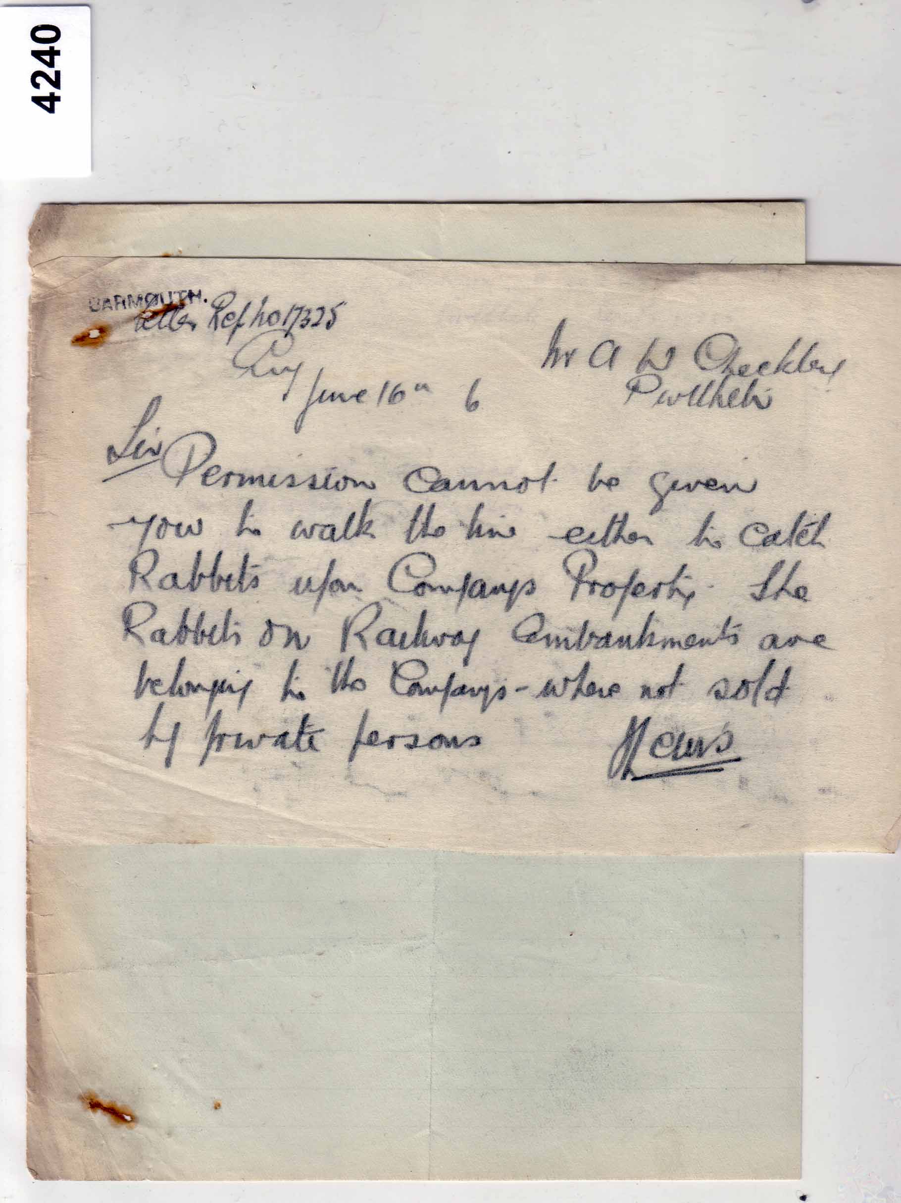 4240 Correspondence 1906 – Letters re catching rabbits Box 14