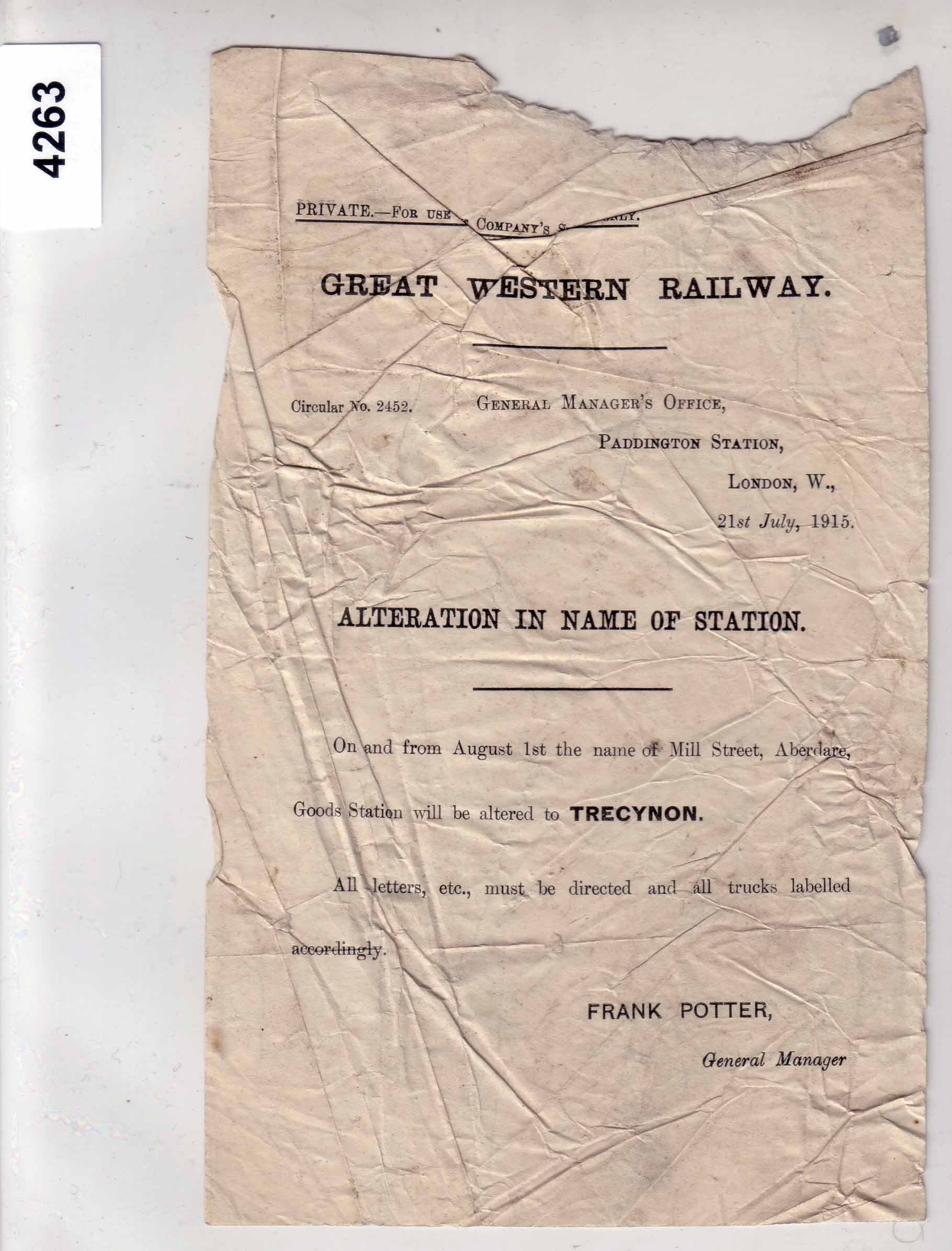 4263 Circular 1915 – Change of station name – Trecynon Box 14