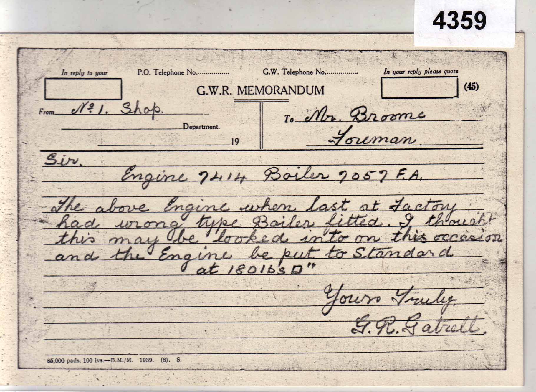 4359 Memorandum 1939 – Copy, wrong Boiler fitted to loco 7414 Box 14