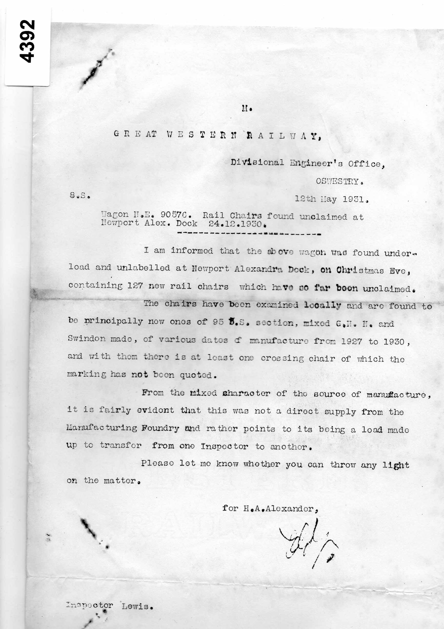 4392 Letter 1931 – Re unclaimed rail chairs Box 15