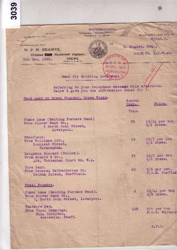 3039 Order for sand, etc. Divisional Mechanical Engineer, Crewe – 1922 Box 1