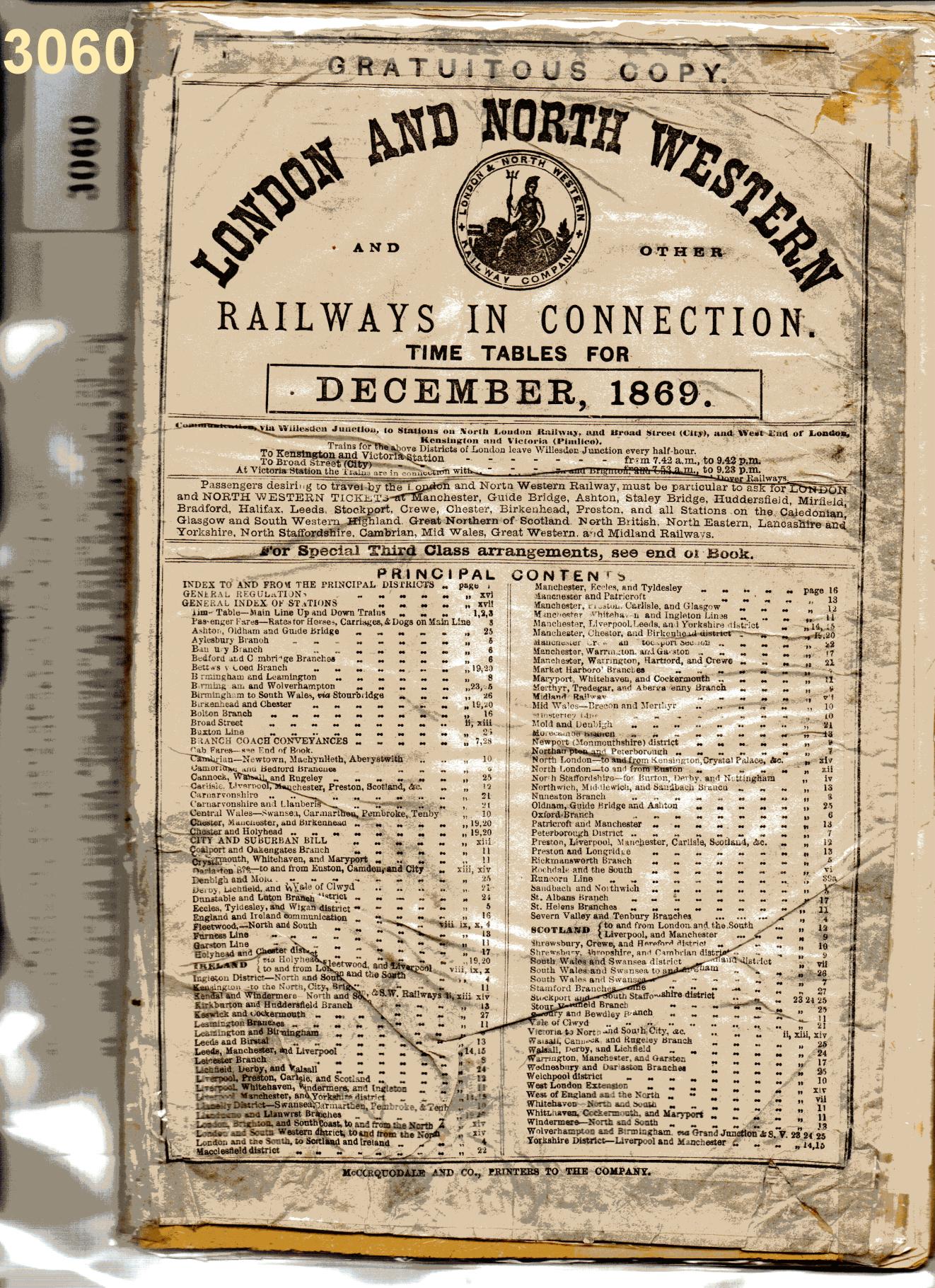3060 Timetable Dec 1869 LNWR Gratuitous Copy Box 1B