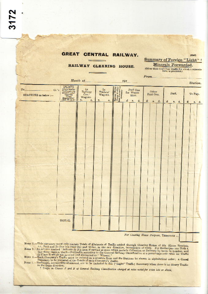 3172 Form to Railway Clearing House. 191- Summary of ‘foreign’ light minerals Box 3A