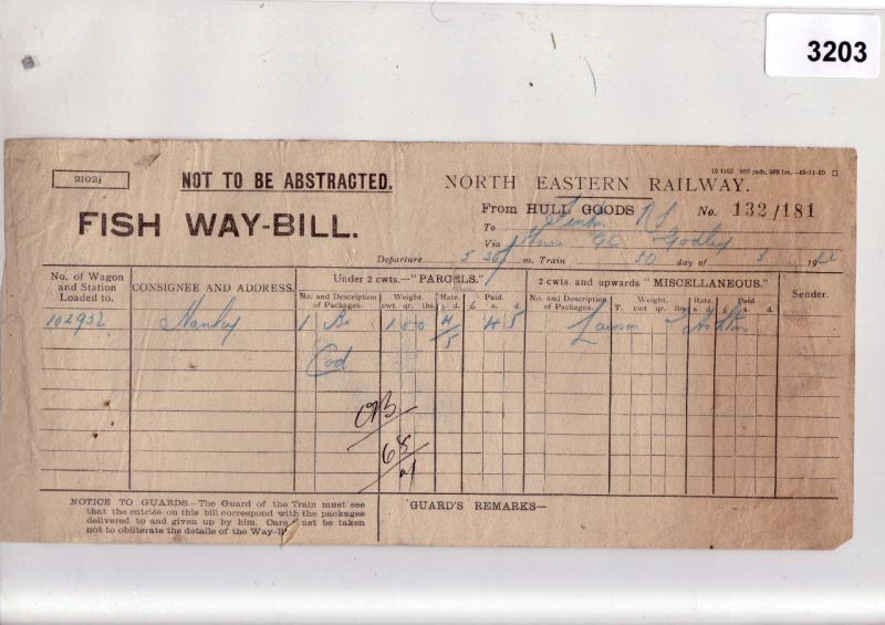3203 Fish Way Bill 1922 – Ex. Hull Goods to Hanley Box 3A