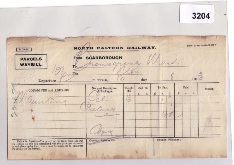 3204 Parcels Way Bill 1913 – Ex. Scarborough to Bromsgrove Box 3A