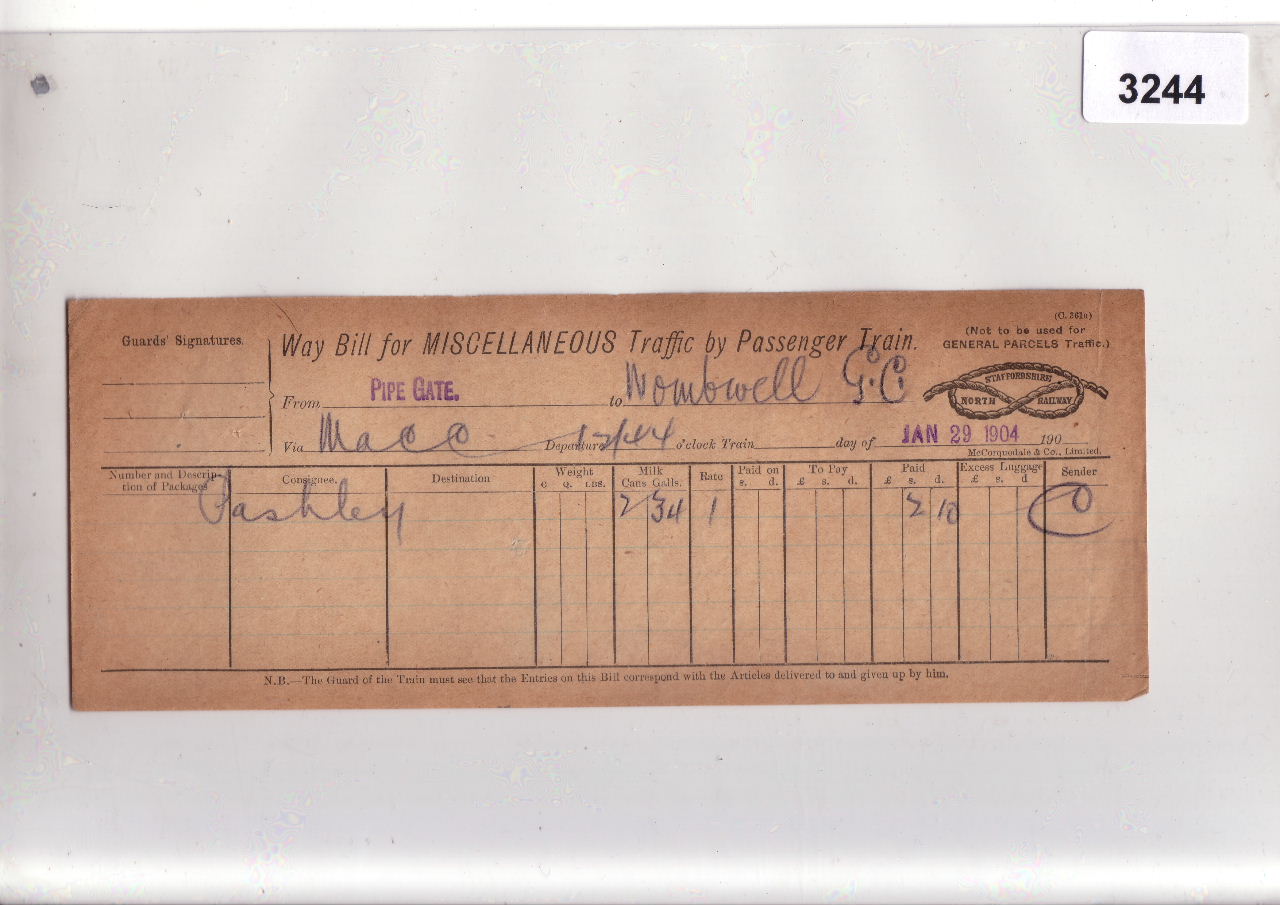 3244 Way Bill 1904 – Miscellaneous traffic by passenger train – Ex Pipe Gate to Wombwell Box 3B