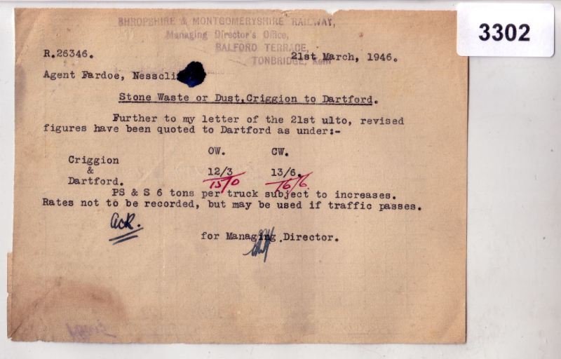 3302 Memorandum 1946 – Revised rate – Criggion to Dartford Box 3B