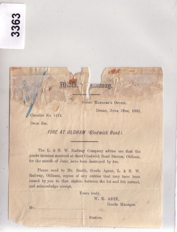 3363 Circular (Goods) 1891 – Fire at Oldham (Glodwick Road) Box 4