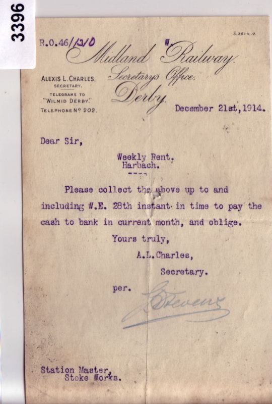 3396 Memorandum 1914 – From Derby office re. weekly rent at Harbach Box 4