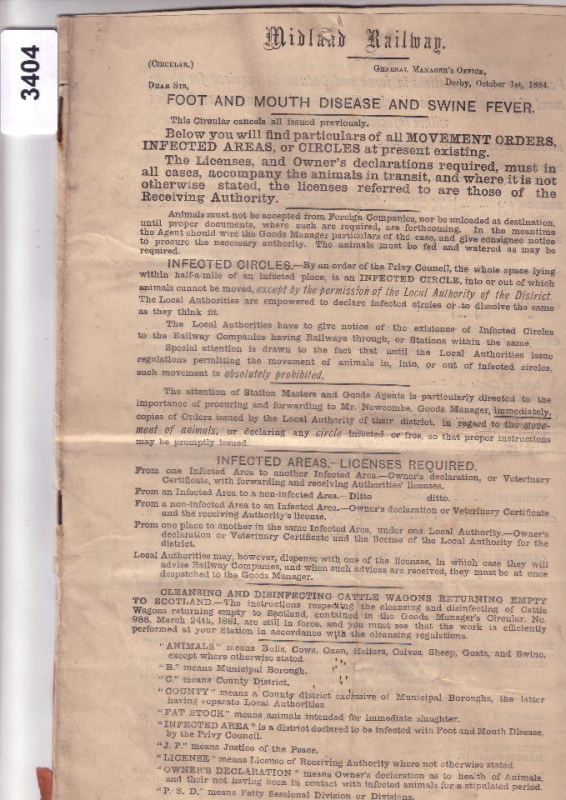 3404 Circular 1884 – Re Foot & Mouth disease and swine fever Box 4
