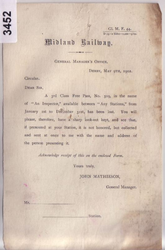 3452 Correspondence 1902 – Letter re lost free pass Box 4