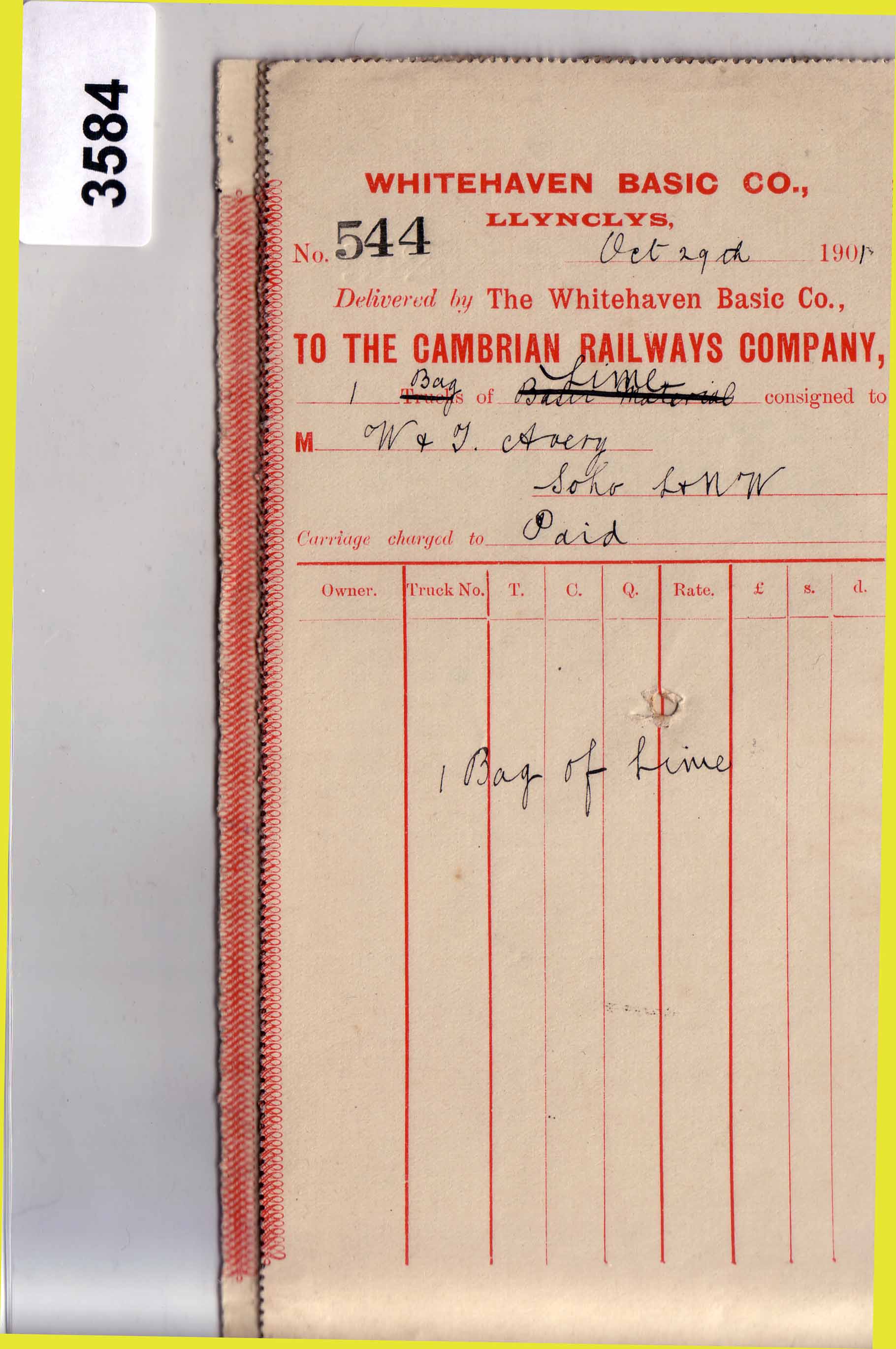 3584 Goods Instructions 1901 – Whitehaven Basic Co., Llynclys Box 7