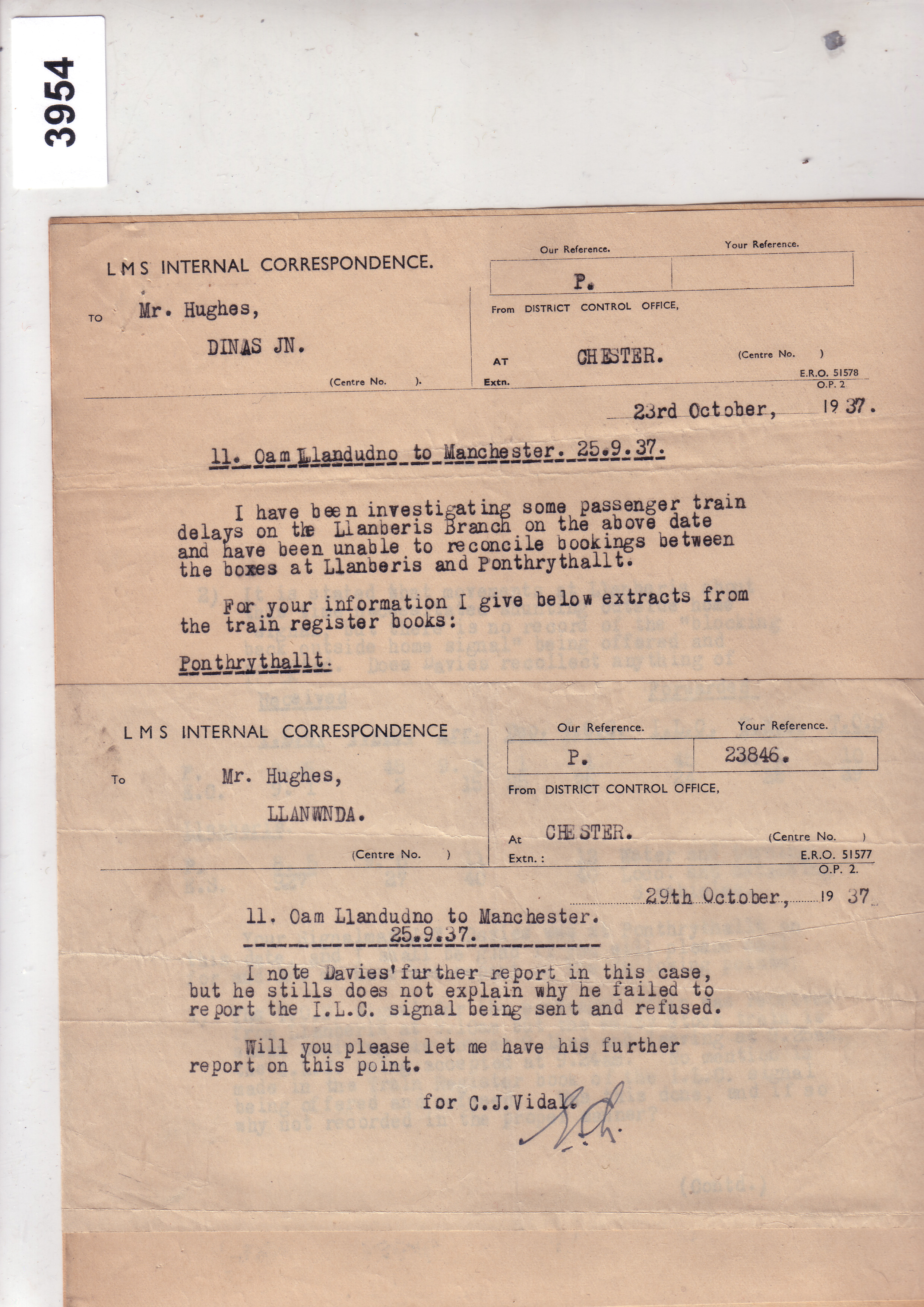3954 Letter 1937 – Re. Train Delays Box 11