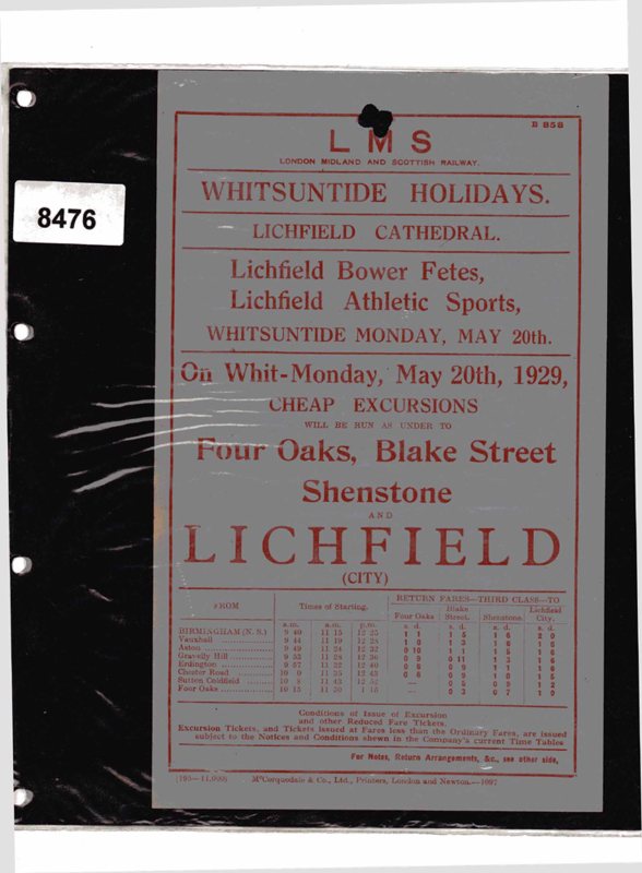 8476 Handbill 1929 — Cheap trips to Lichfield Bower & Sports Arch File 8