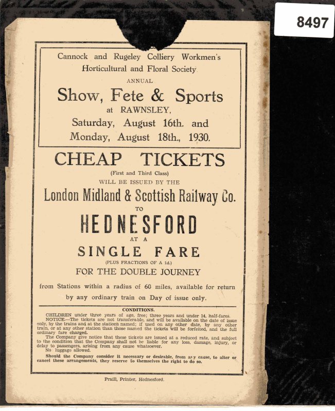 8497 Handbill 1930 – Cheap tickets to Hednesford for CRC Workmen’s Show Arch File 8