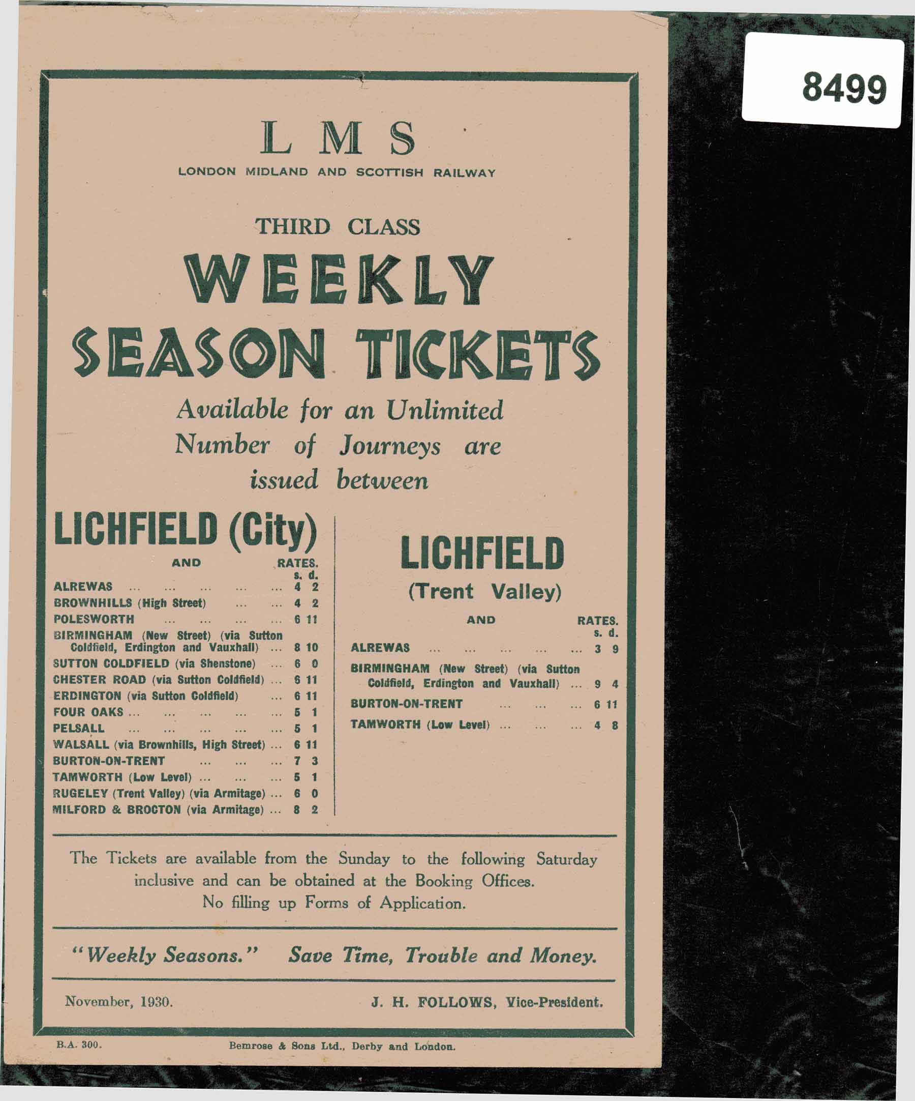 8499 Handbill 1930 – Weekly Season Tickets to Lichfield from local stations Arch File 8