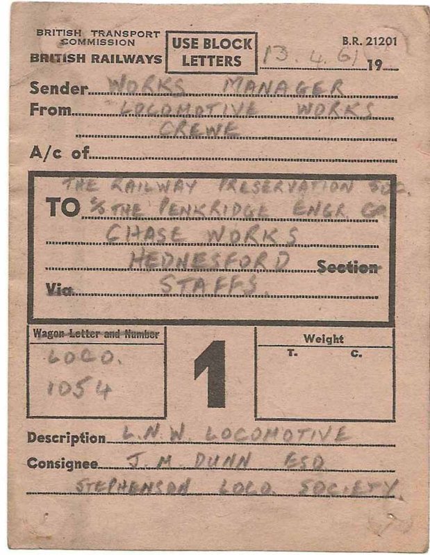 10722 Label Label accompanying loco No.1054 from Crewe to Hednesford C8