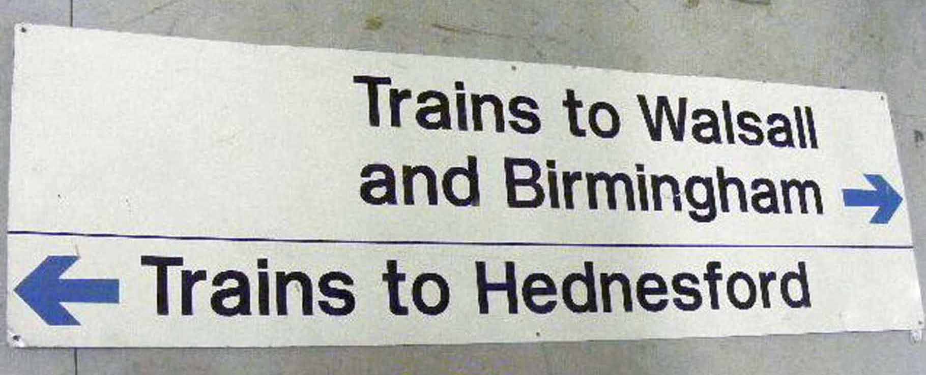 95 Platform direction sign BR ‘Trains to Walsall and Birmingham, Trains to Hednesford’ R5.B1.S1