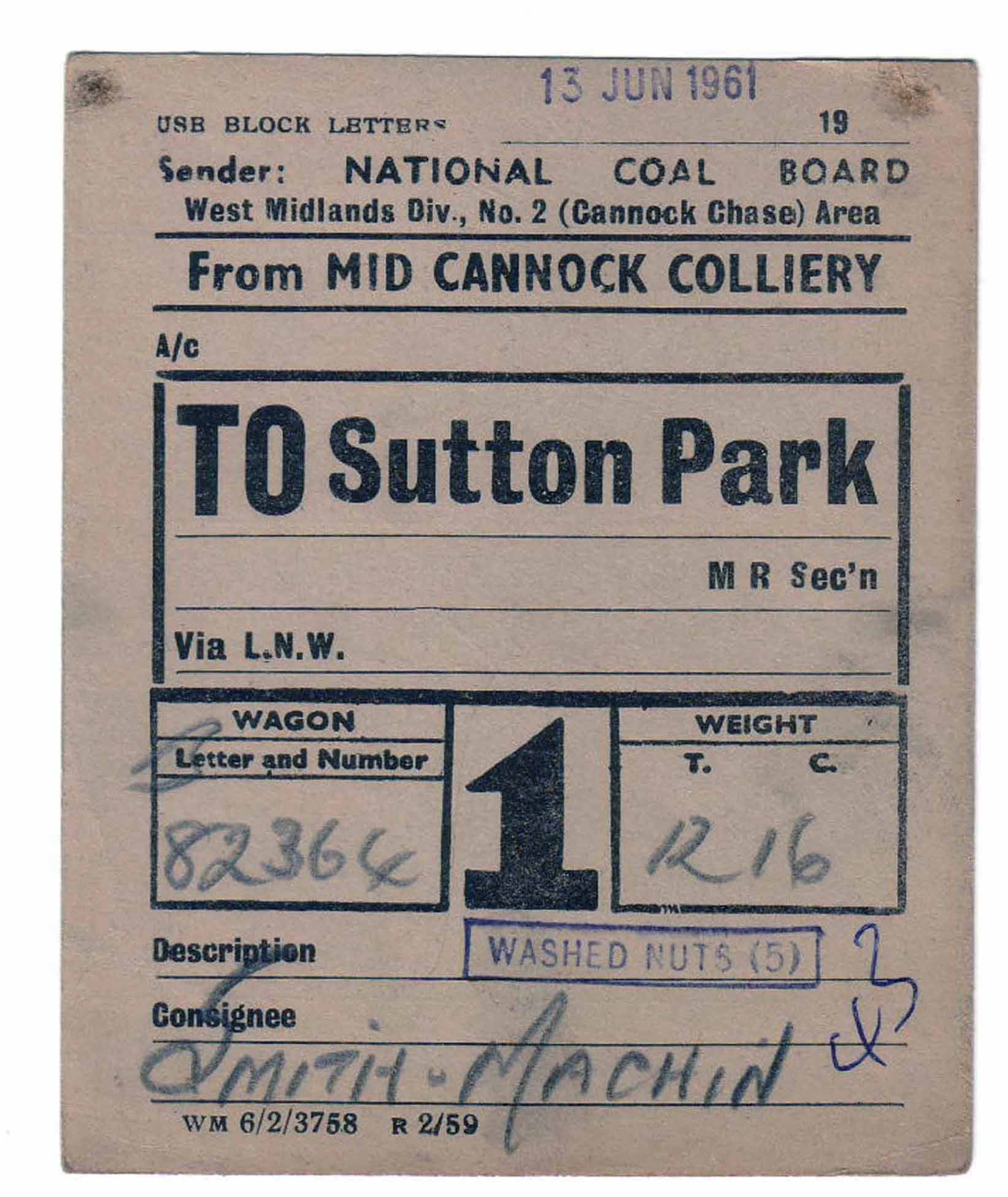 1184 Wagon Label 1961 Mid Cannock to Sutton Park NCB – Mid Cannock Colliery C8