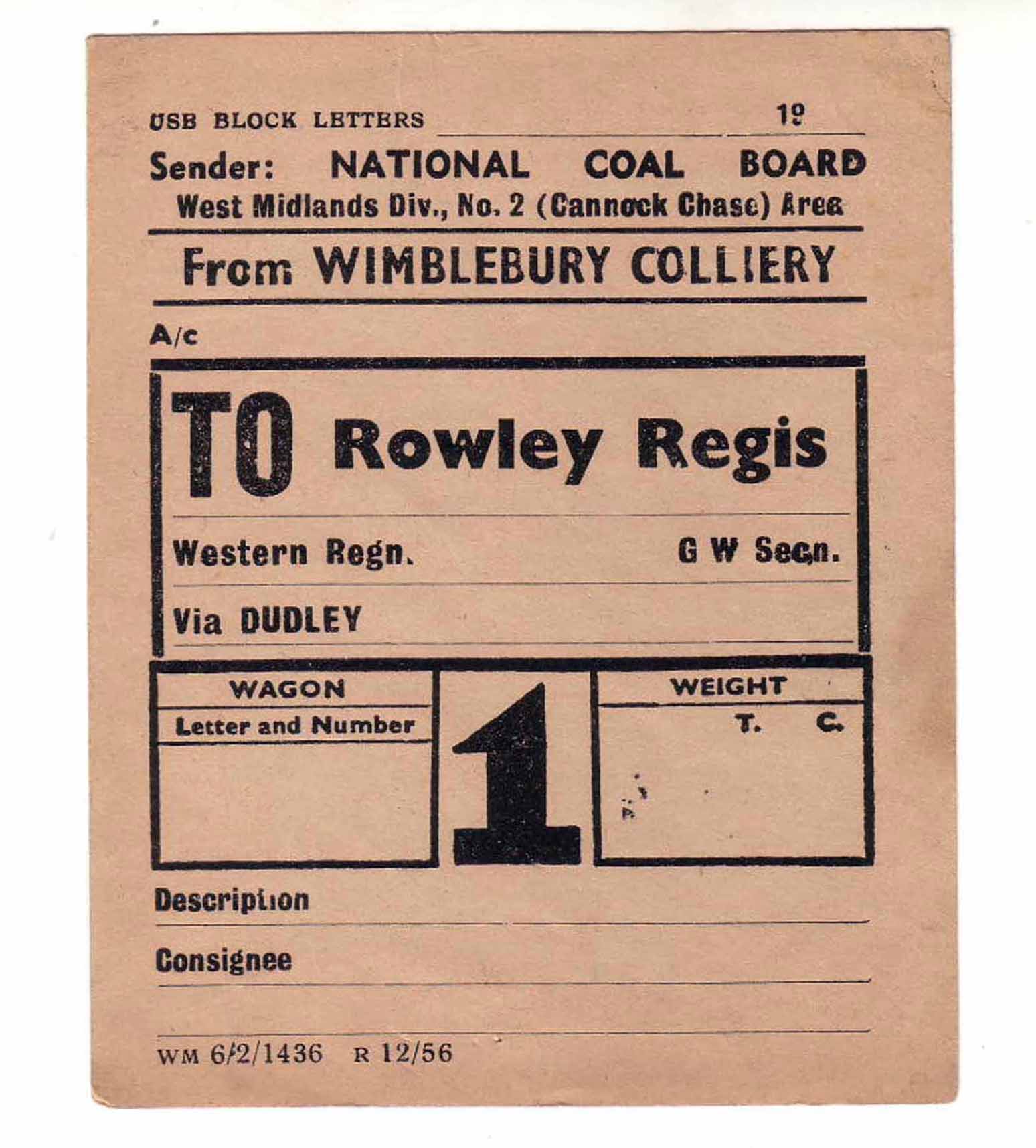 1193 Wagon Label Wimblebury to Rowley Regis NCB – Wimblebury Colliery C8