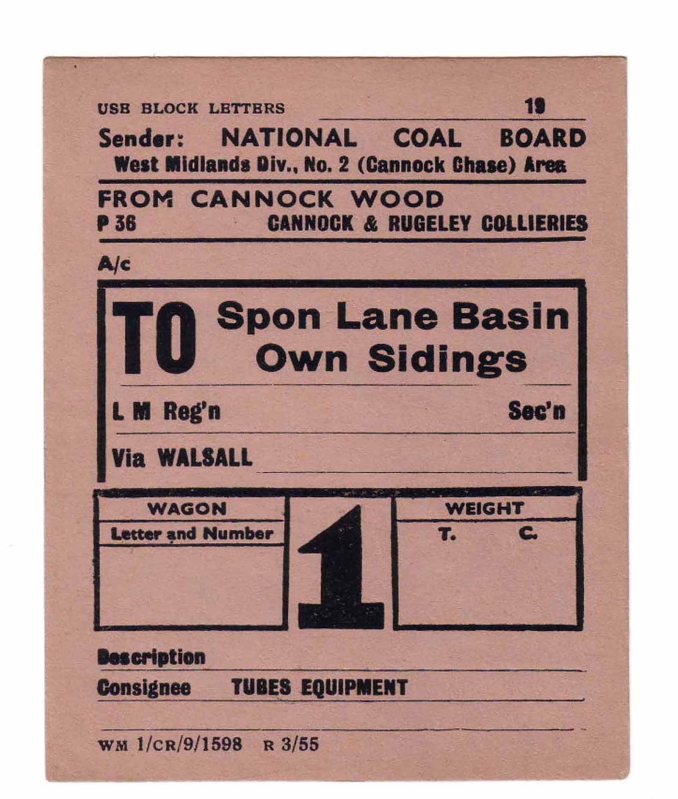 1225 Wagon Label Cannock Wood to Spon Lane Basin NCB – Cannock & Rugeley Collieries C8