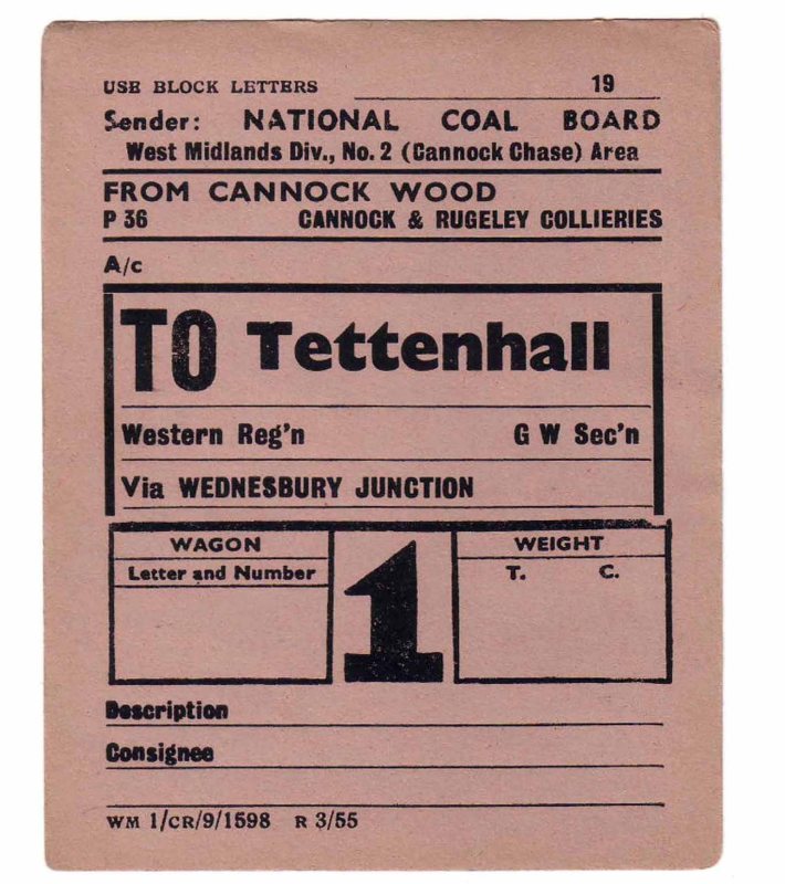 1227 Wagon Label Cannock Wood to Tettenhall NCB – Cannock & Rugeley Collieries C8