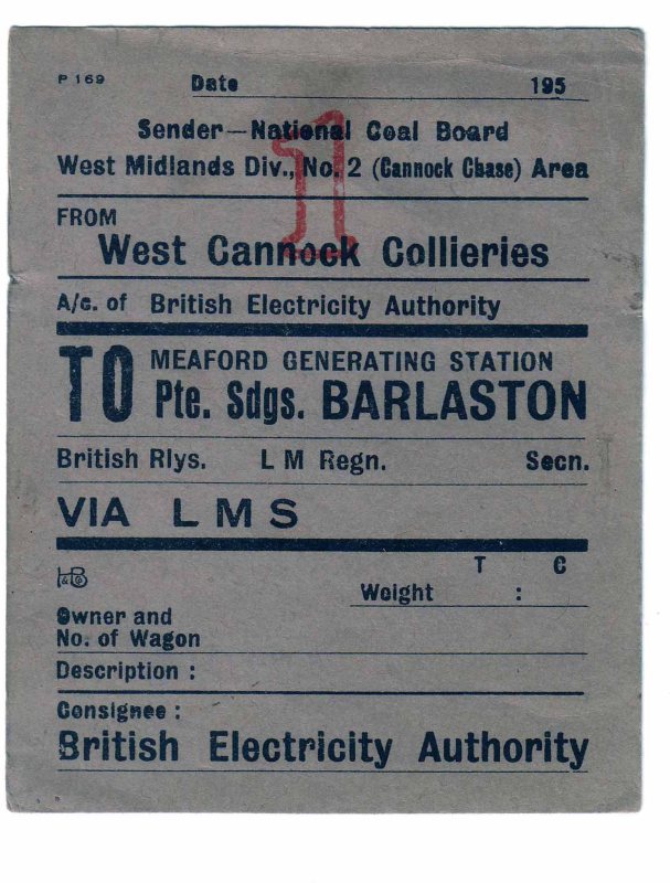 1395 Wagon Label West Cannock to Meaford, Barlaston NCB West Cannock Collieries C15