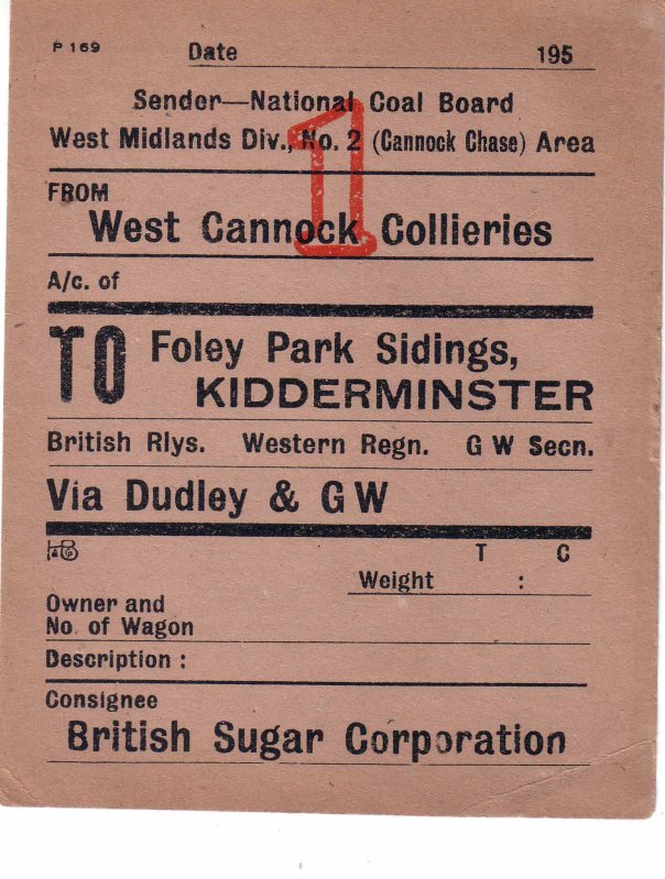 1399 Wagon Label West Cannock to Kidderminster NCB West Cannock Collieries C15