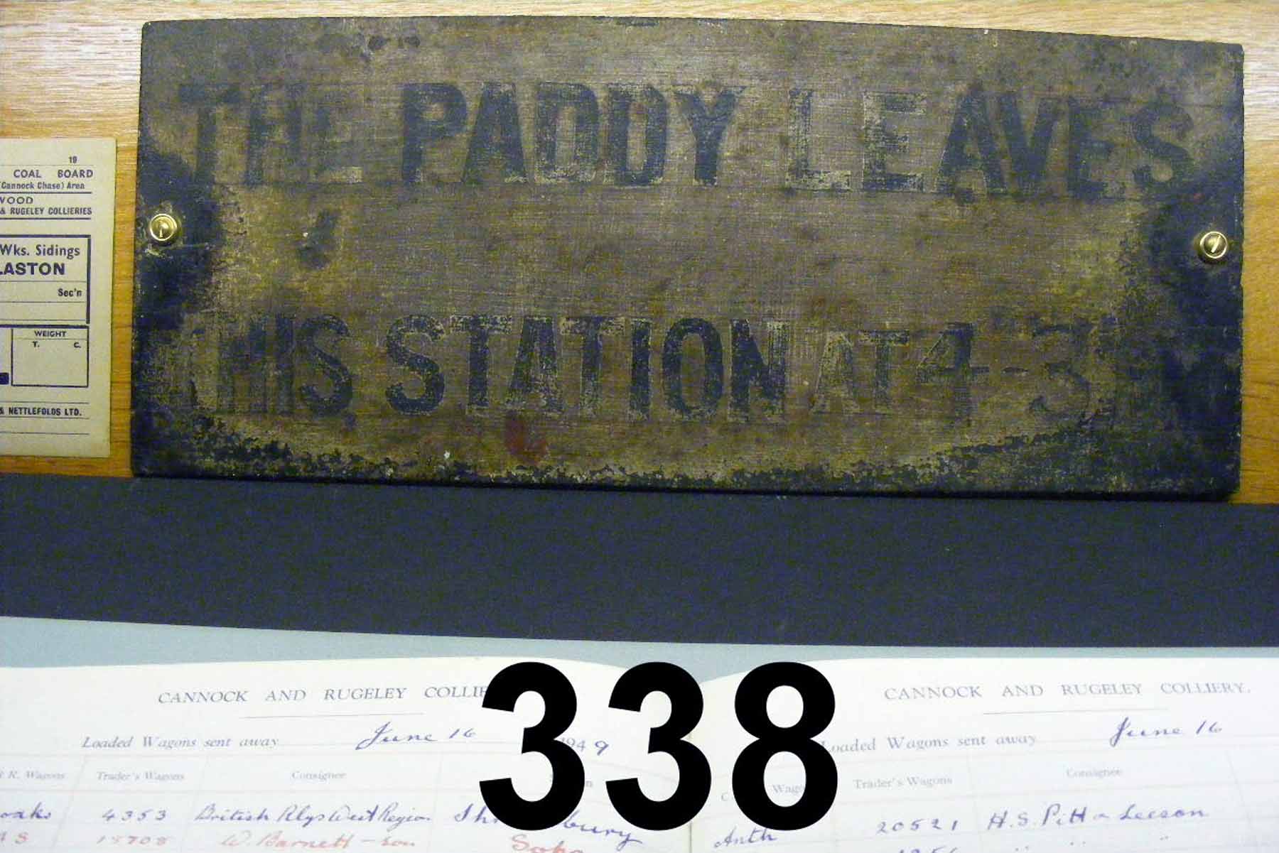 338 Wooden Notice ‘Paddy leaves this station at 4.30’ CRC C15
