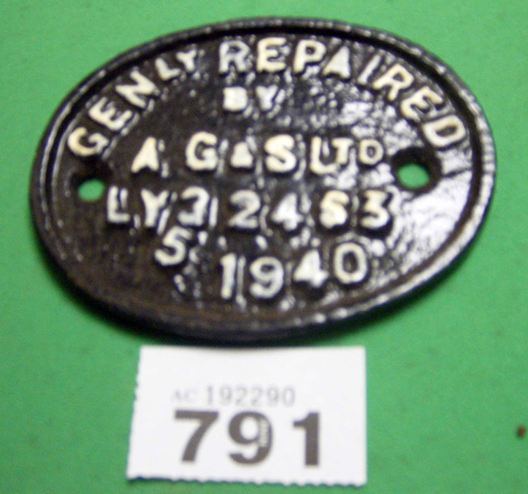 791 Wagon plate Generally repaired by A.G.& S. Ltd. LY3 2453 5 – 1940 L&Y C16