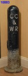 The Great Western Railway (GWR) markers were made of Brunel-designed bridge rails cut into lengths, with an angle iron T-piece on the bottom, and a cast iron top, moulded round the rail.  Between 1880 and 1920, the year of manufacture was included on the cast top.  The Midland Railway (MR) used pieces of ordinary bull-head rail whose tops were stamped into an oval shape, with the raised letters ‘MR’.