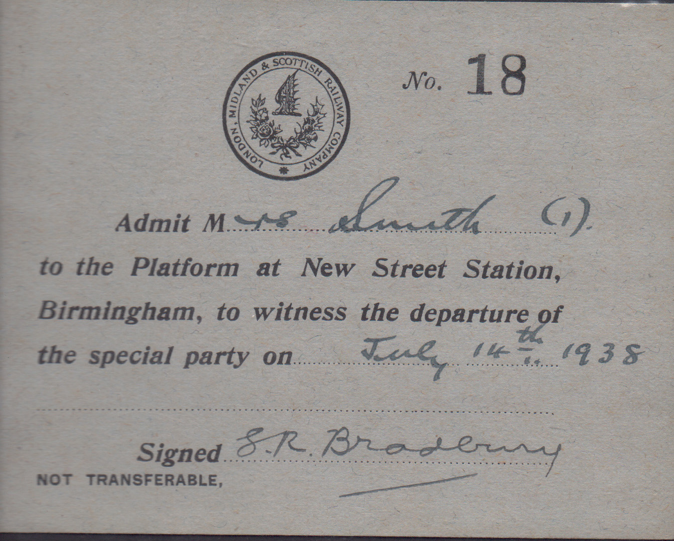 Each is accomanied by an identically worded typewritten note – ‘This permit will only be honoured at the Worcester Street entrance to the Queen’s Drive, New Street Station, L.M.S. Railway.  The holder or holders must be in their places in the reserved enclosure in the centre of the Queen’s Drive by 4.0 p.m.’