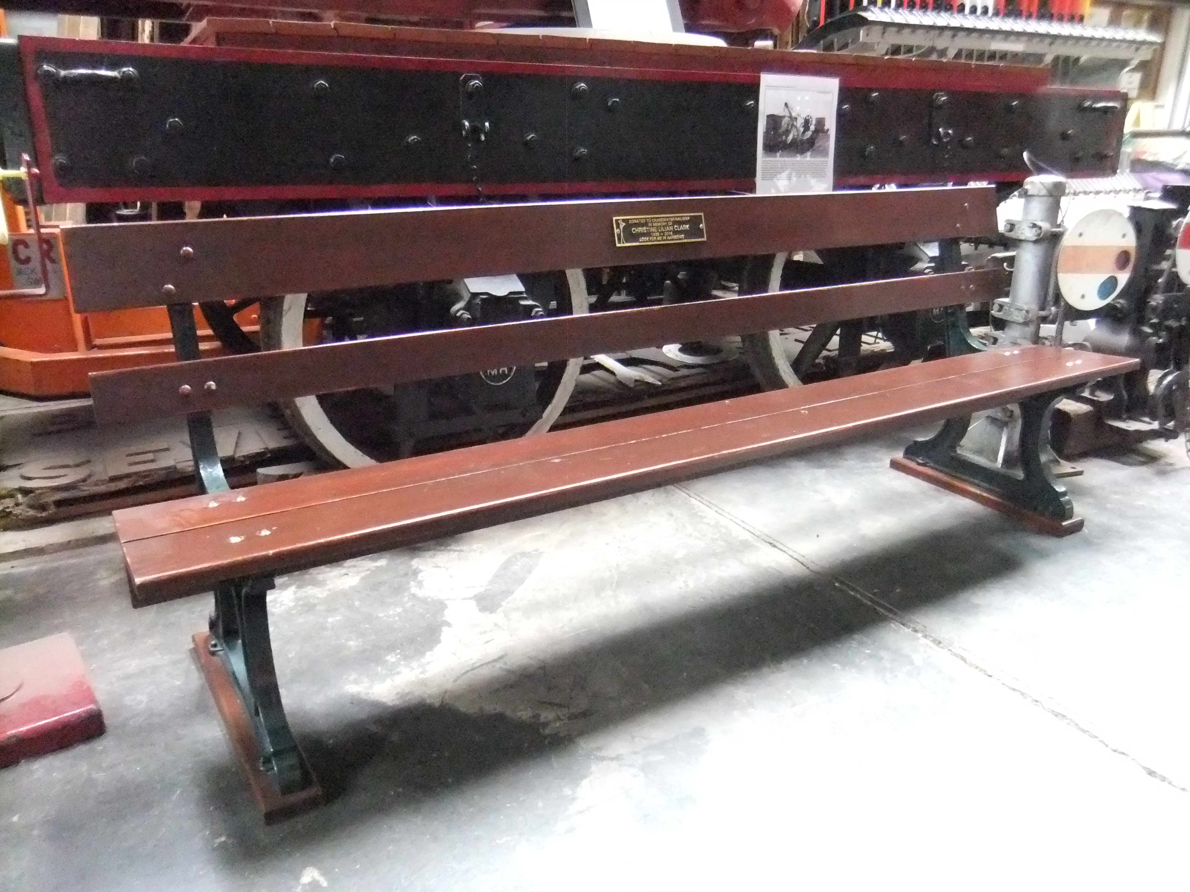 Refurbished outdoor-type bench given to the railway by Mr.George Clark in memory of his wife, Christine.  There are no makers’ marks on the bench, but it may have been on the London, Tilbury and Southend Line at some point. This bench will replace the one which has been on the platform for some years and will now be refurbished by the same man who refurbished the bench in the museum, courtesy of Godfrey and Marion’s Bench Fund. When completed, this bench will be found a home inside at one of the stations.