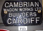 - 733 Wagon plate Cambrian Wagon Works Ltd., Builders, Cardiff. Cambrian Wagon Works Ltd. W3