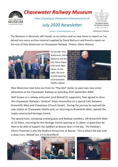 Chasewater Railway Museum Newsletter July 2020 – 2 Pages