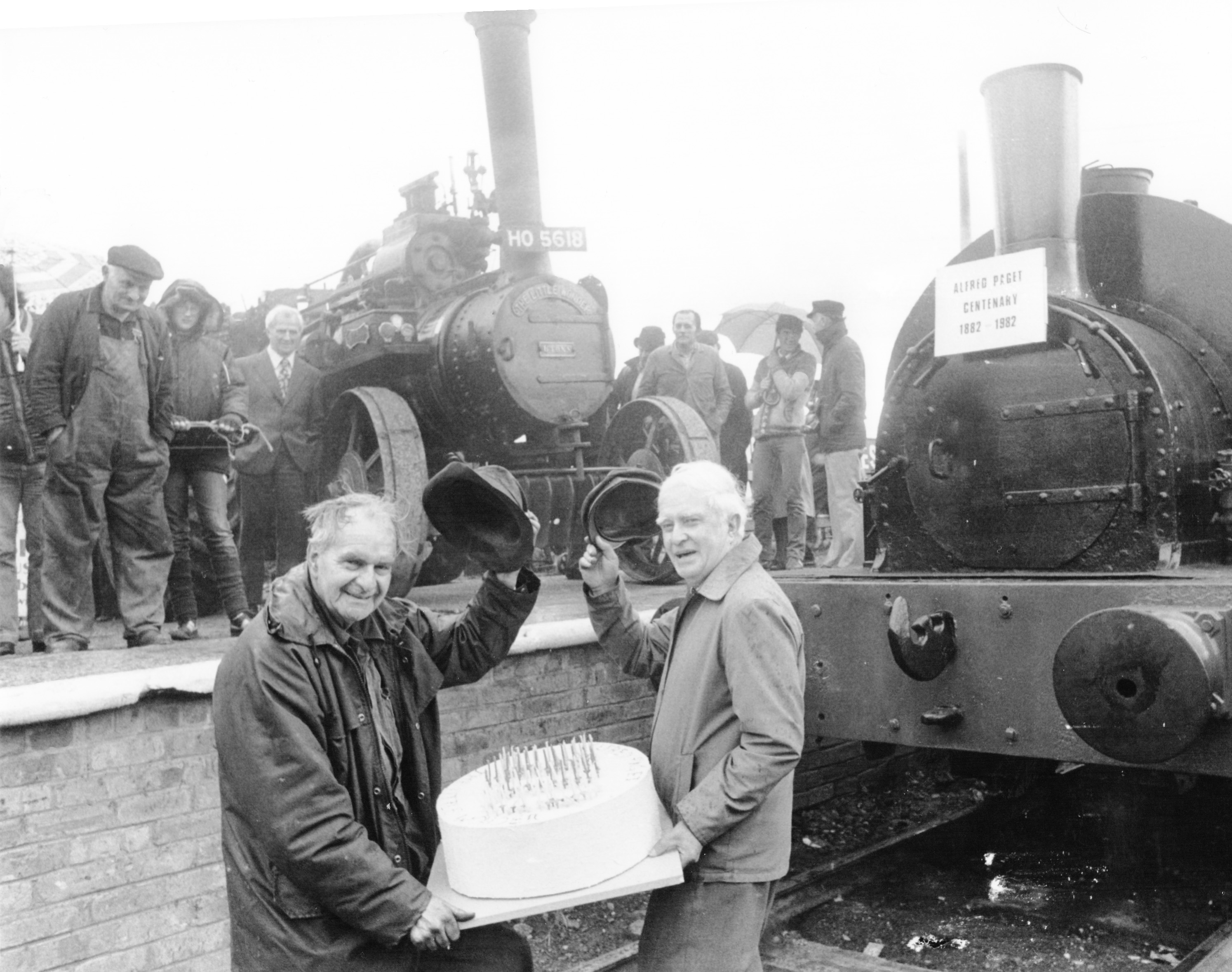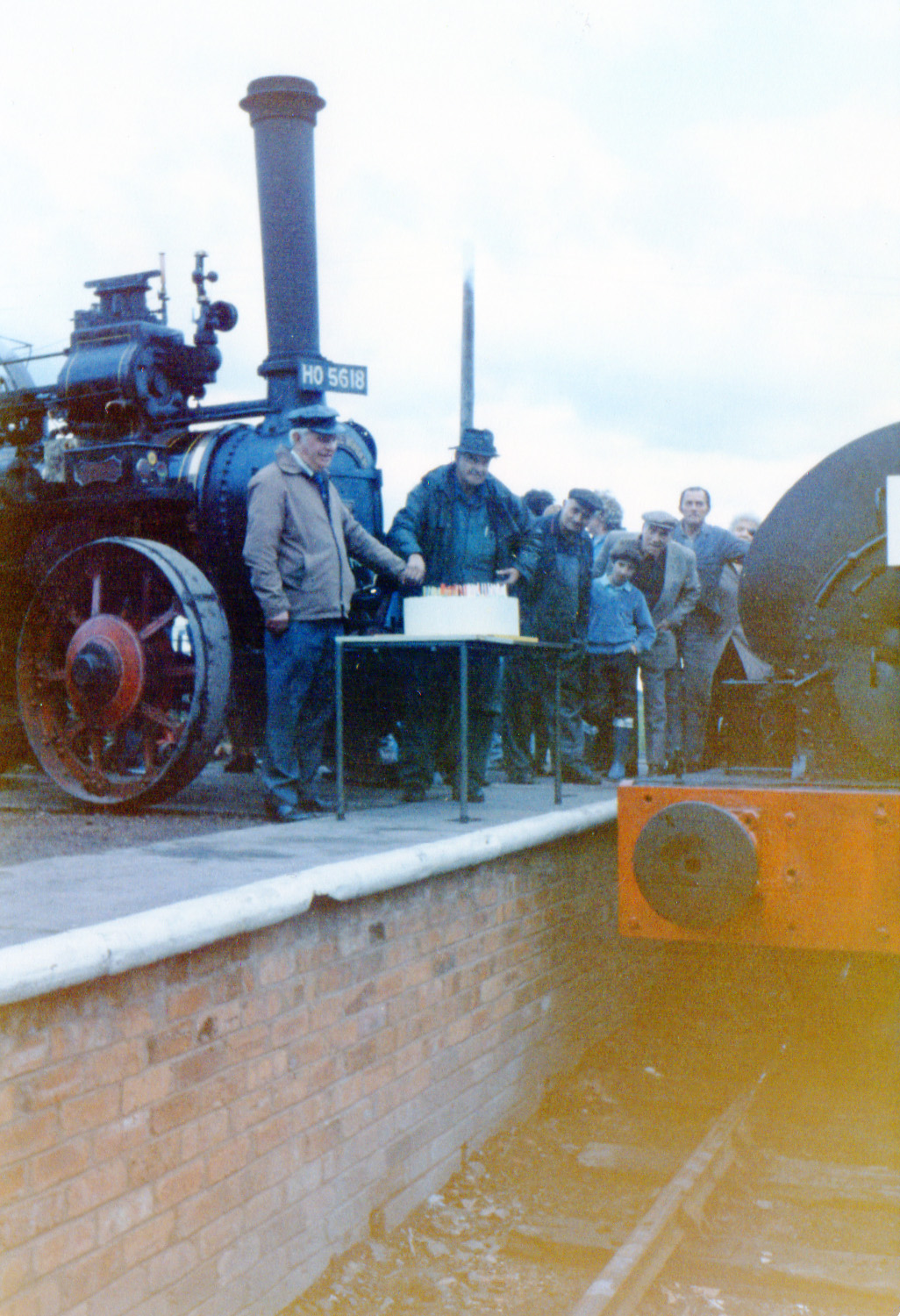 The gentlemen in the photo holding the cake are the late Johnny Mayes, at the time the owner of ‘Little Wonder’,  and the late David Ives of Chasewater Railway, on the right.